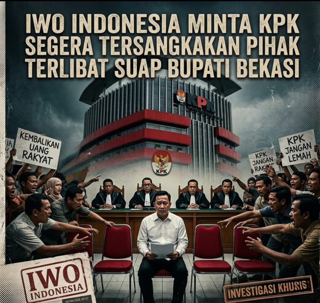 IWO Indonesia juga mendesak KPK RI untuk segera mentersangkakan semua pihak yang terlibat kasus suap Bupati Bekasi yang sudah menikmati aliran dana dari Sarjan yang sudah di sebutkan oleh Jaksa dalam surat dakwaan di pengadilan Tipikor Bandung pada 9/3/2026.