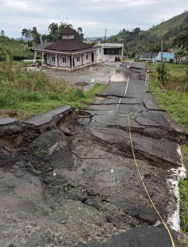 – Jalan ambles di Desa Ratamba Kecamatan Pejawaran, Banjarnegara semakin parah. Jumlah rumah yang terdampak kini mencapai 15 rumah.
