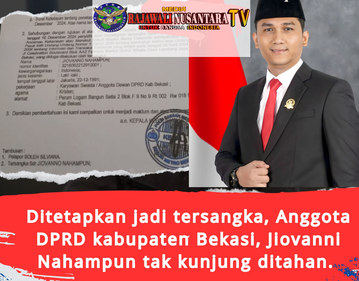 – Jiovanno Nahampun, anggota DPRD Kabupaten Bekasi, kini tengah menghadapi proses hukum setelah ditetapkan sebagai tersangka pada 16 Desember 2024. Pria berusia 34 tahun itu diduga terlibat dalam kasus ancaman kekerasan sebagaimana diatur dalam Pasal 29 jo 45B UU No. 1 Tahun 2024 tentang Perubahan Kedua UU No. 11 Tahun 2008. Namun, meskipun telah ditetapkan sebagai tersangka, hingga saat ini Jiovanno belum juga ditahan oleh pihak kepolisian.