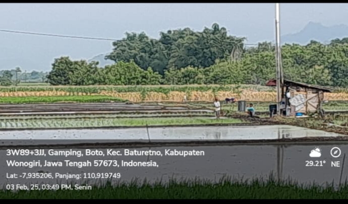 – Di kawasan Ngawu Boto Baturwtno, Edi Suroso, seorang petani setempat, tengah mengelola sawah seluas 22.000 meter persegi dengan pola tanam 30 x 30 cm.